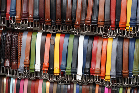 sale of belts for jeans and trousers, texture, different colors. Varieties of belts for sale