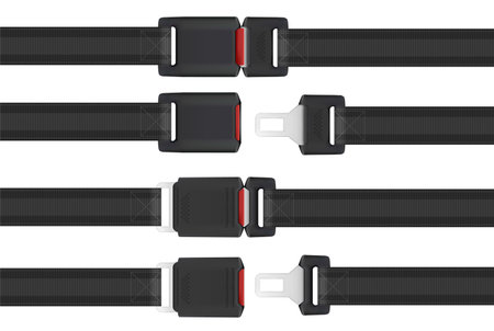 Black seatbelt buckle set with red release button and metal tongue for car safety equipment. Open and closed positions with textured strap. Vehicle restraint system components for automotive use.