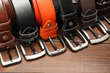 Old retro style male belts on the wooden table flat lay background with copy space.