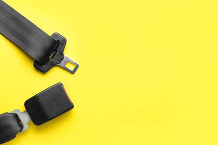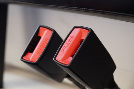 Word press on a seat belt, close up, transportation safety concept background, black seats