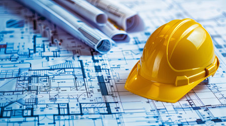 A yellow safety helmet rests on detailed architectural blueprint plans, highlighting construction planning and safety.
