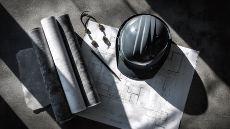 Blueprint rolls and a safety helmet are neatly arranged on a flat surface, illuminated by overhead lighting, showcasing a focus on construction planning.