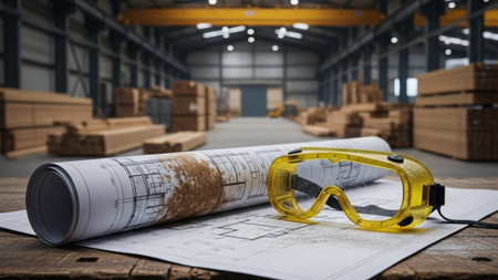 A high-quality image depicting an architectural blueprint on a wooden table, surrounded by essential construction tools and safety gear, capturing the essence of project planning and design.