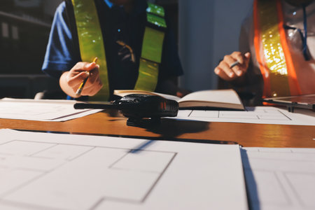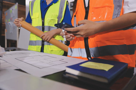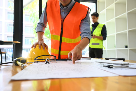 Architects man wearing reflective jackets working with blueprints, planning development details at meeting table.