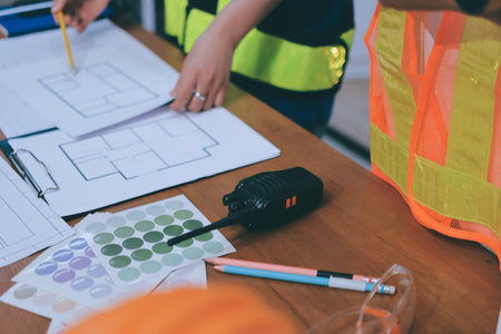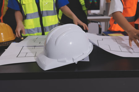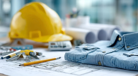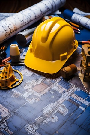 Engineering workspace with blueprints, helmets, and tools for planning and construction