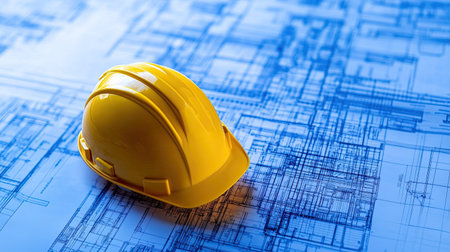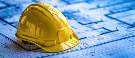 A bright yellow construction helmet placed on a detailed blueprint, representing safety and meticulous planning in engineering and construction projects.
