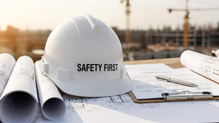 A white hard hat, labeled Safety First, rests on a desk next to rolled blueprints and a pen. The scene likely takes place outdoors, with construction cranes visible in the distance. The lighting is bright, and the overall composition suggests a focus on the construction industry, potentially for architectural or engineering projects. Ideal for commercial applications.
