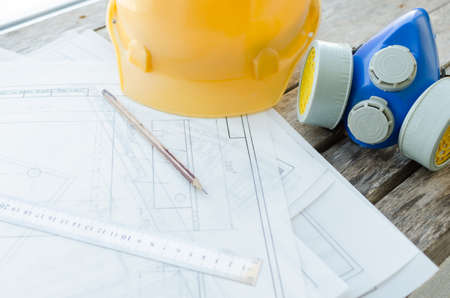 Engineering workplace, drawings, protective construction helmet and dust mask on the desktop, the view from the top