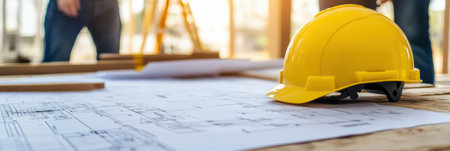Planning and Safety in Construction Work: Yellow Construction Helmet on Blueprints at a Construction Site. Concept Construction Safety, Planning, Blueprints, Construction Site, Yellow Helmet