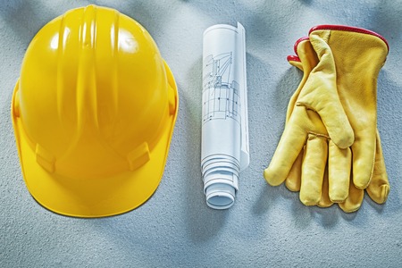Building helmet protective gloves blueprints on concrete surface construction concept.