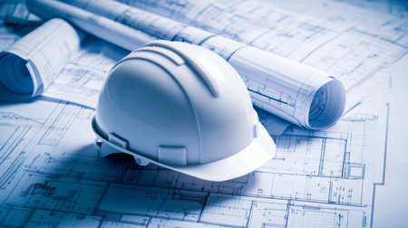 White helmet and blueprints symbolizing professional architecture and construction expertise