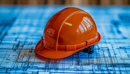 Bright orange safety helmet rests on detailed blueprints and architectural drawings, evoking a sense of precision and readiness for construction proje