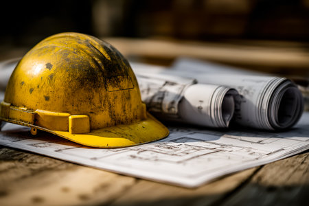 An aged yellow safety helmet rests atop detailed blueprints and rolled architectural drawings spread out on a rustic wooden work surface, capturing a busy construction si