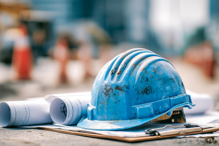 A rugged, faded blue helmet sits atop detailed construction drawings and spread-out blueprints, set against the backdrop of an active outdoor site with softly focused saf