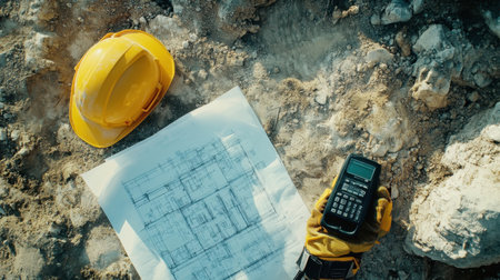 A gray background with concrete floor tiles, a yellow construction helmet, and blueprints on the side, in a flat lay composition, close-up, high-resolution photography, with insanely detailed, fine details, isolated plain, a stock photo, professional color grading, and white lighting. --chaos 30 --ar 16:9 --v 6.1 Job ID: 15f13c16-474b-4b03-8139-c77058fb7ed0
