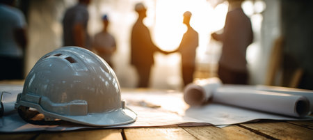 Safety Helmet and Architectural Plans in Sunlit Construction Office