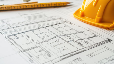 A detailed close-up of a construction blueprint featuring a yellow hard hat and a wooden pencil, symbolizing the essential elements of engineering and planning in construction projects.