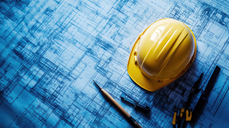 A yellow hard hat rests on a detailed blueprint, surrounded by drafting tools, symbolizing engineering projects, construction planning, and design safety measures.