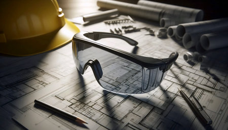 A detailed view of construction plans with essential tools and safety helmets, highlighting the importance of safety in construction projects.