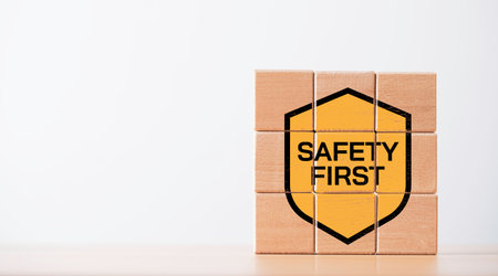 Safety first concept with yellow shield icon on wooden blocks which it symbolizing risk management of workplace safety , protection policy compliance and prevention strategy.