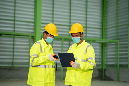 Engineer wearing protective mask to Protect Against Covid-19 and checking production process at the construction site,Engineer,Construction concept,Coronavirus has turned into a global emergency.