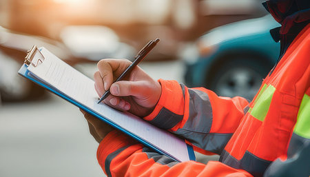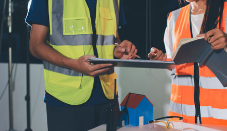 Job hazard Assessment (JHA) paper document work on the table with defocused male hand writing with blue pencil at the background construction site Perth