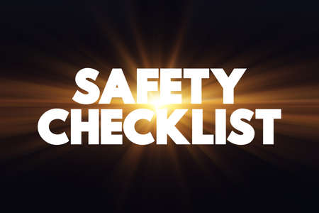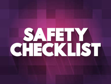 Safety Checklist text on paper card with magnifying glass and stationary on wooden background