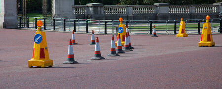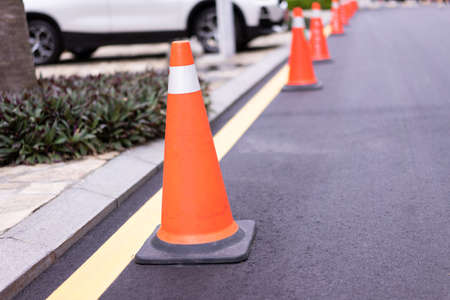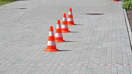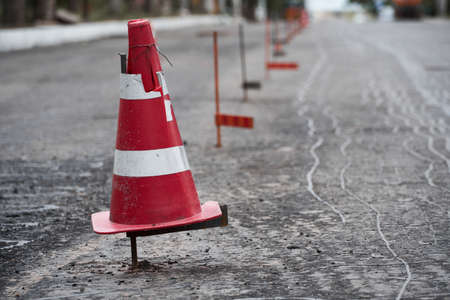 Road fence. Markings on the road. Fencing of repair work on the highway. Orange caps.