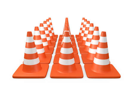 Group of orange highway traffic cones with white stripes, isolated on white background.