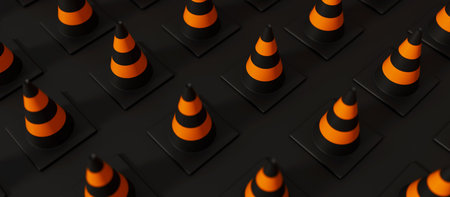 Numerous unmarked orange traffic cones on concrete. This image is a 3d rendering an features a shallow depth of field.