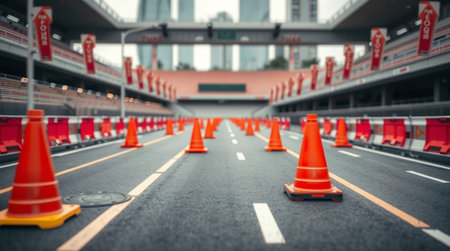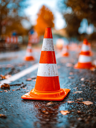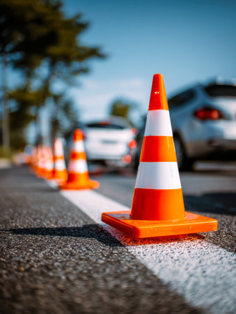 Vibrant orange and white safety cones stretch along a smooth asphalt lane, signaling caution amid daylight and clear weather, perfect for roadwork or