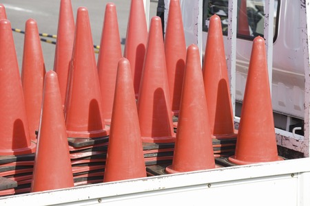 Picture of many striped road cones beside road. Warning symbols for traffic control on blurred outdoor background.