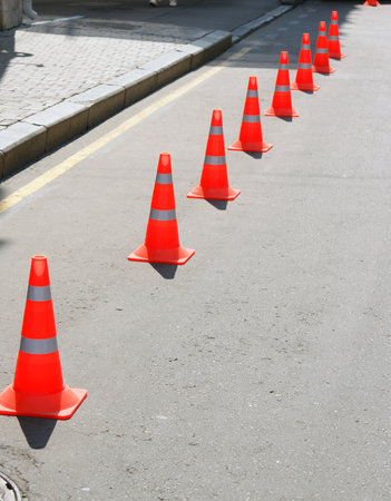 Bright orange cones line a bustling city street under sunlight, creating a barrier for ongoing construction and adding a vibrant safety element to urb