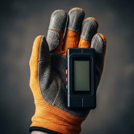 Photo of a male worker in orange jacket uniform and gloves holding a black smartphone.