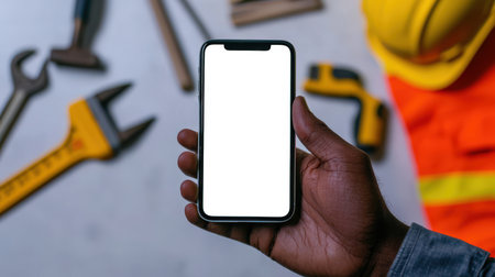 Discounts and promotions on construction tools. Close-up of a construction worker holding a mobile phone in his hand with an empty white screen on the background of a table with tools. Phone mockup. The holiday is Builder's Day. Presentation of the mobile application.