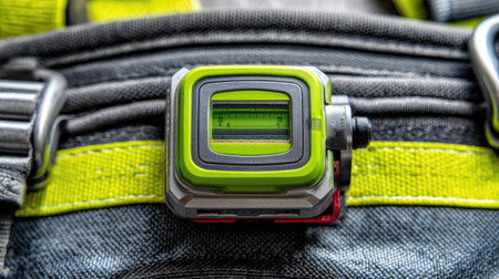 This image showcases a green measuring level tool positioned on a safety harness, featuring vibrant yellow details, ideal for construction and tool-focused applications.