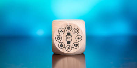 Wooden block with symbol of wearable technology concept on blue background