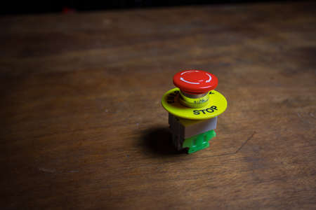 Emergency stop button, Disaster protection. Industrial concept. Red button on table in dark low key background. Selective focus