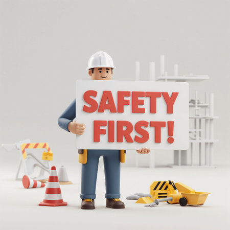 Wooden blocks spelling Safety First are placed next to a yellow hardhat and a yellow toy tractor. A construction worker in an orange vest and blue shirt stands blurred in the background.