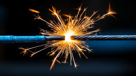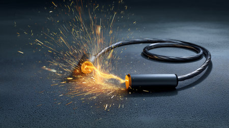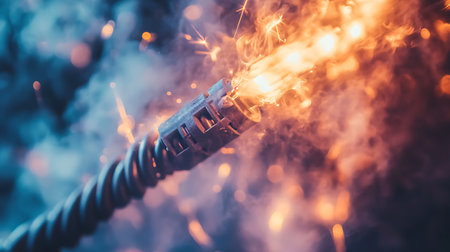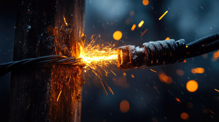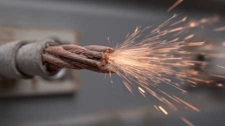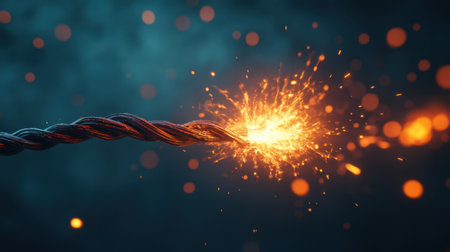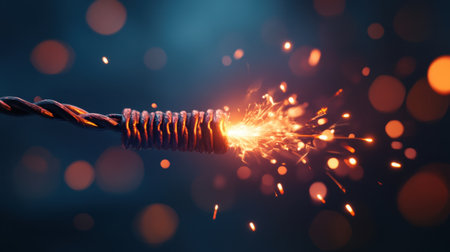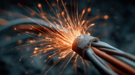 Damaged cable with sparks glowing against a dark background, capturing a high-energy moment of electrical failure