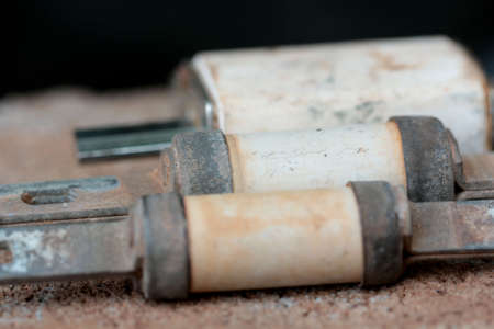 Old electric power supply boxes. Industrial background. Overloaded electrical circuit causing fuse to break. Electricity short circuit, Electrical failure resulting in electricity wire burnt