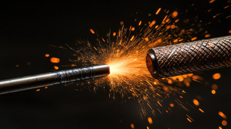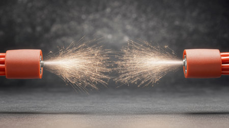This striking image captures close-up details of metal cables producing bright sparks in a dark setting, highlighting energy and tension.