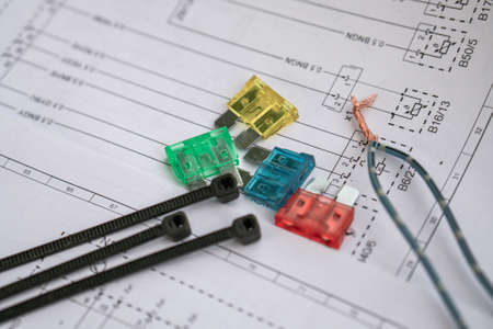 Car fuse. Pile od colorful electrical automotive fuses or circuit brea