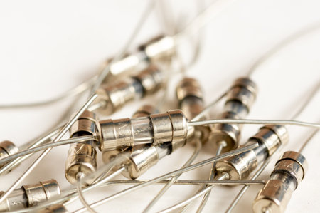 Closeup of small electrical fuses pile on blurry background with colored and white bokeh. Safety device for overcurrent protection with fusible wire in transparent glass tube with two metal terminals.