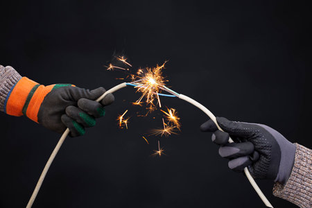 Hands with protection gloves and electric wires, making a controlled explosive short circuit with bright orange sparks on black background,