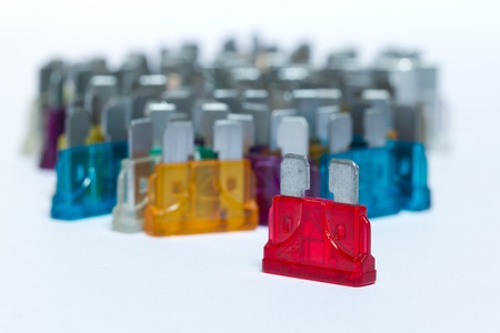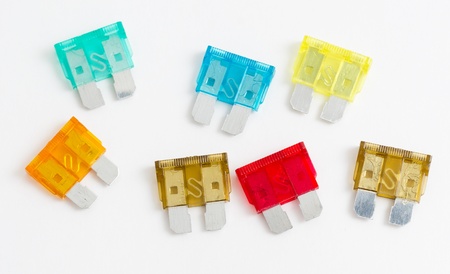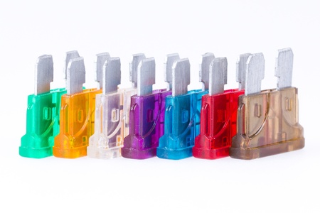 Different colors of car fuses with a white background