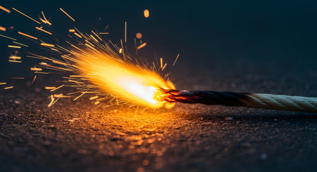 A dramatic close-up of a lit fuse burning rapidly, throwing off bright orange sparks and flames. The rope-like fuse is lying on a dark, textured surface, creating a sense of urgency, danger, and imminent explosion. This image represents concepts like deadlines, risk, and countdowns.