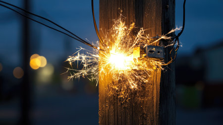 This captivating image captures the moment a spark erupts from an electrical short circuit on a wooden post at sunset, showcasing the beauty and danger of electricity.