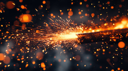 This dynamic close-up image showcases bright glowing sparks flying from a metal surface against a dark background, creating a vivid and energetic atmosphere.