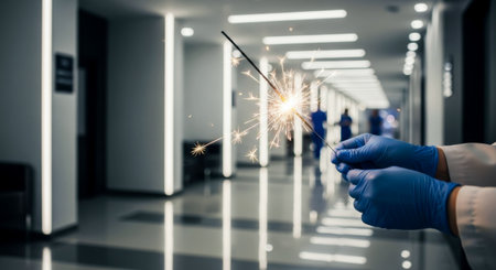 Doctor holding sparkler in hospital hallway. New Year celebration at work with festive and hopeful mood.